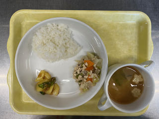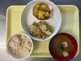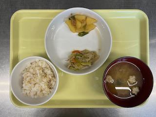 10月2日(木) 今日の給食 2025 10/07 びさいの給食 2025年10月7日 ★昼食★ ・玄米ごはん ・豚肉と野菜の塩麹炒め ・じゃがいものなめたけ和え ・みそ汁 ★午後間食★ ・かぼちゃ蒸しパン _ (幼児移行食) (3歳未満児) (3歳以上児) (午後間食) びさいの給食 10月1日(水) 今日の給食 10月6日(月) 今日の給食