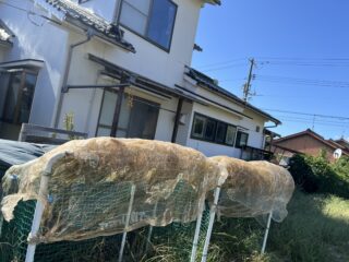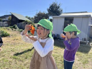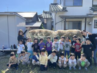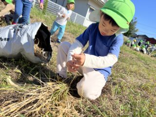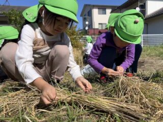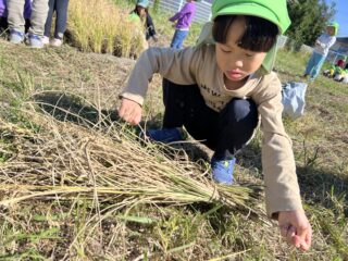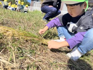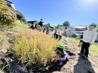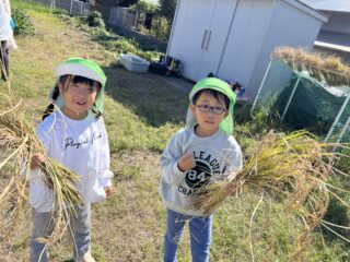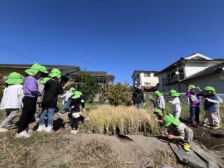 青空広がる秋晴れの日…菜園では年長すみれ組が稲刈りをしていました!