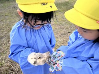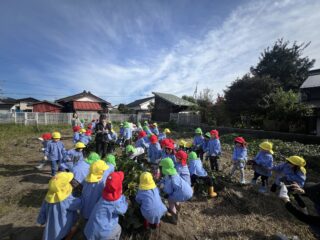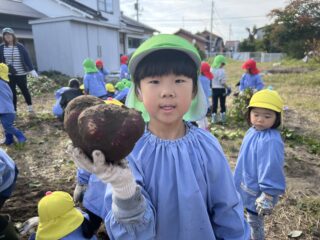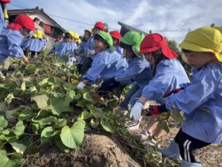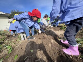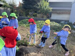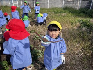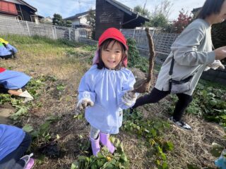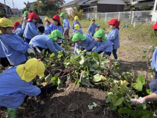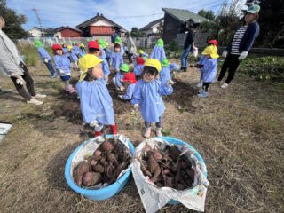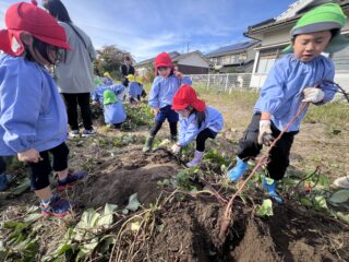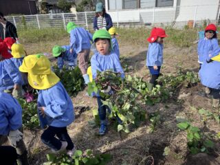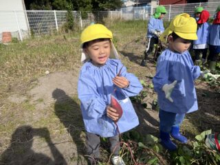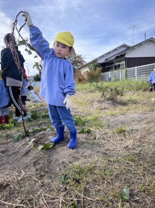 3歳以上児は縦割りチームに分かれ、おいも掘りに出かけました♪