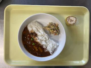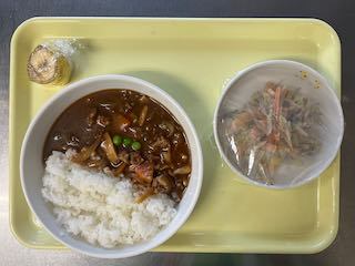 1月21日(水) 今日の給食 2026 1/21 びさいの給食 2026年1月21日 ★昼食★ ・ハヤシライス ・ごぼうのカミカミサラダ ・バナナ ★午後間食★ ・おむすび(おかか・のり) ー (幼児移行食) (3歳未満児) (3歳以上児) (午後間食) びさいの給食 1月20日(火) 今日の給食